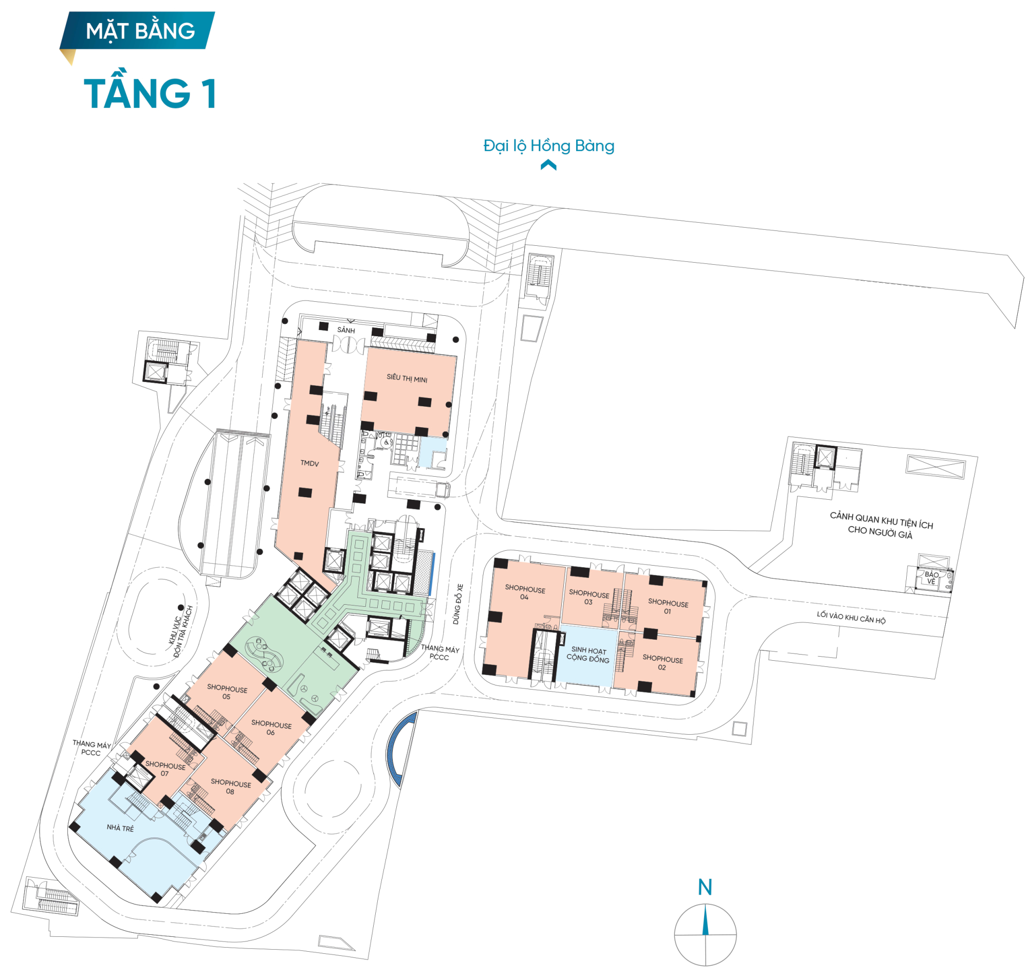 Tầng 1 là tầng thương mại – dịch vụ, không bố trí căn hộ ở. Toàn bộ mặt sàn được dành cho 8 căn shophouse (đánh số từ 01 đến 08) phân bổ dọc mặt ngoài tòa nhà, tận dụng lợi thế 3 mặt tiền đường Hồng Bàng – Ba Tháng Hai – Minh Phụng để phục vụ kinh doanh bán lẻ và dịch vụ.