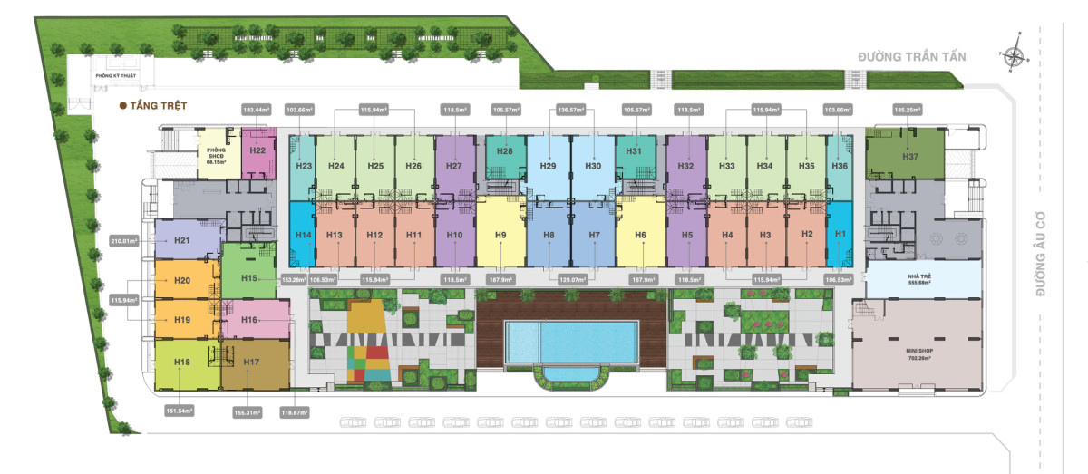 Mặt bằng tầng trệt Melody Residences Âu Cơ là nơi tập trung toàn bộ tiện ích thương mại và công cộng của dự án, bao gồm: 37 căn shophouse (diện tích 104 – 185 m²), trung tâm thương mại (702 m²) và nhà trẻ (556 m²). Các shophouse được bố trí dọc theo mặt tiền 2 block, phục vụ nhu cầu kinh doanh và mua sắm cho cư dân.