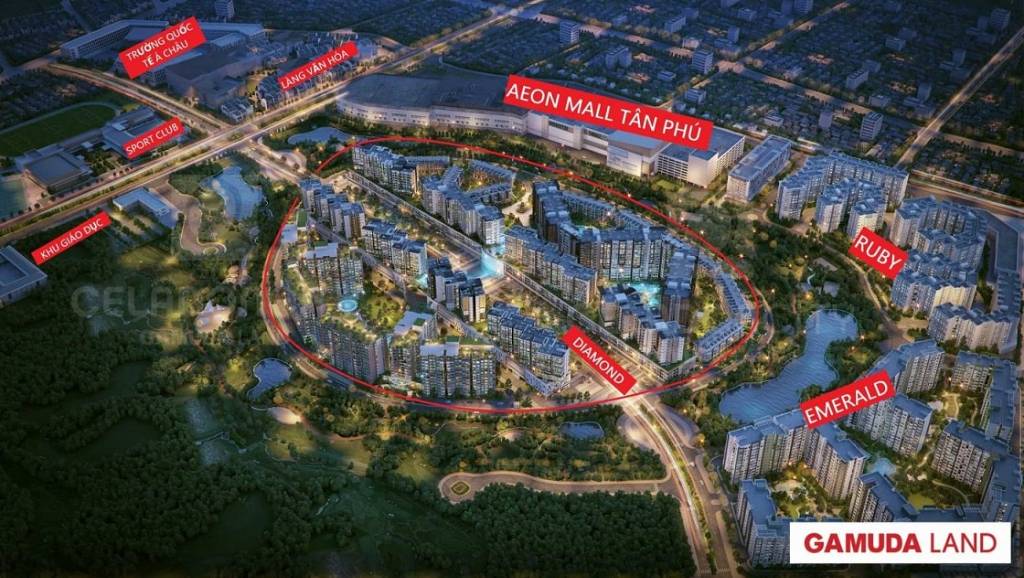 Cụ thể, Diamond Precinct (gồm Diamond Brilliant 8,02 ha, Diamond Alnata, Diamond Alnata Plus và Diamond Centery 5,21 ha) tọa lạc vị trí trung tâm – cao cấp nhất khu đô thị. Emerald Precinct (4,71 ha) nằm phía Tây tiếp giáp đường Bình Long và kênh 19/5. Ruby Precinct (4,19 ha) ở vị trí cổng chính khu đô thị. Topaz Residence (0,81 ha) mặt tiền Bờ Bao Tân Thắng. Khu Officetel (0,46 ha) phục vụ nhu cầu văn phòng kết hợp lưu trú. Bao quanh khu đô thị là các tuyến đường lớn: Lê Trọng Tấn, Bờ Bao Tân Thắng, Bình Long, Tân Kỳ Tân Quý.