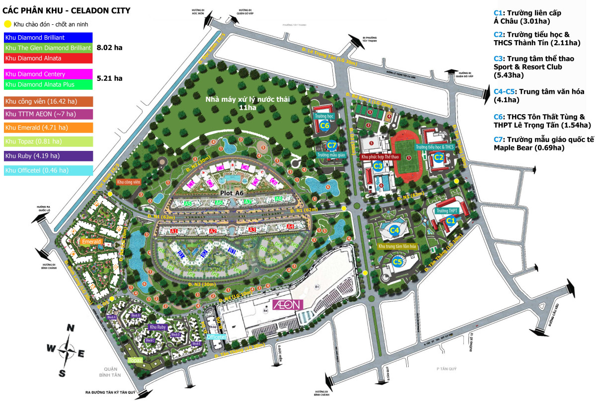 Mặt bằng tổng thể Celadon City – 82,5 ha, 5 phân khu, công viên sinh thái 16,4 ha, TTTM Aeon Mall 7 ha
