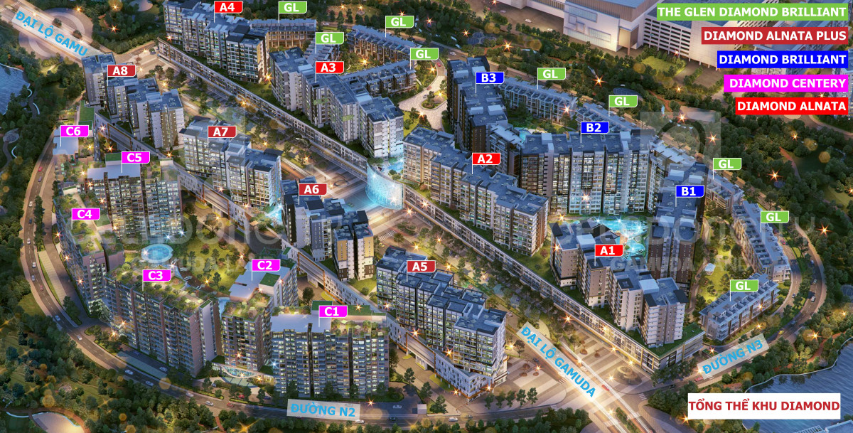 Diamond Precinct được quy hoạch thành 4 tiểu khu: Diamond Alnata, Diamond Alnata Plus, Diamond Brilliant và Diamond Centery. Toàn khu được tổ chức theo trục Đại lộ Gamuda chạy xuyên tâm – đóng vai trò trục kết nối chính, đồng thời bao quanh bởi 2 tuyến đường N2 và N3 tạo thành vành đai giao thông, giúp liên kết và phân luồng tiếp cận vào từng cụm tháp.