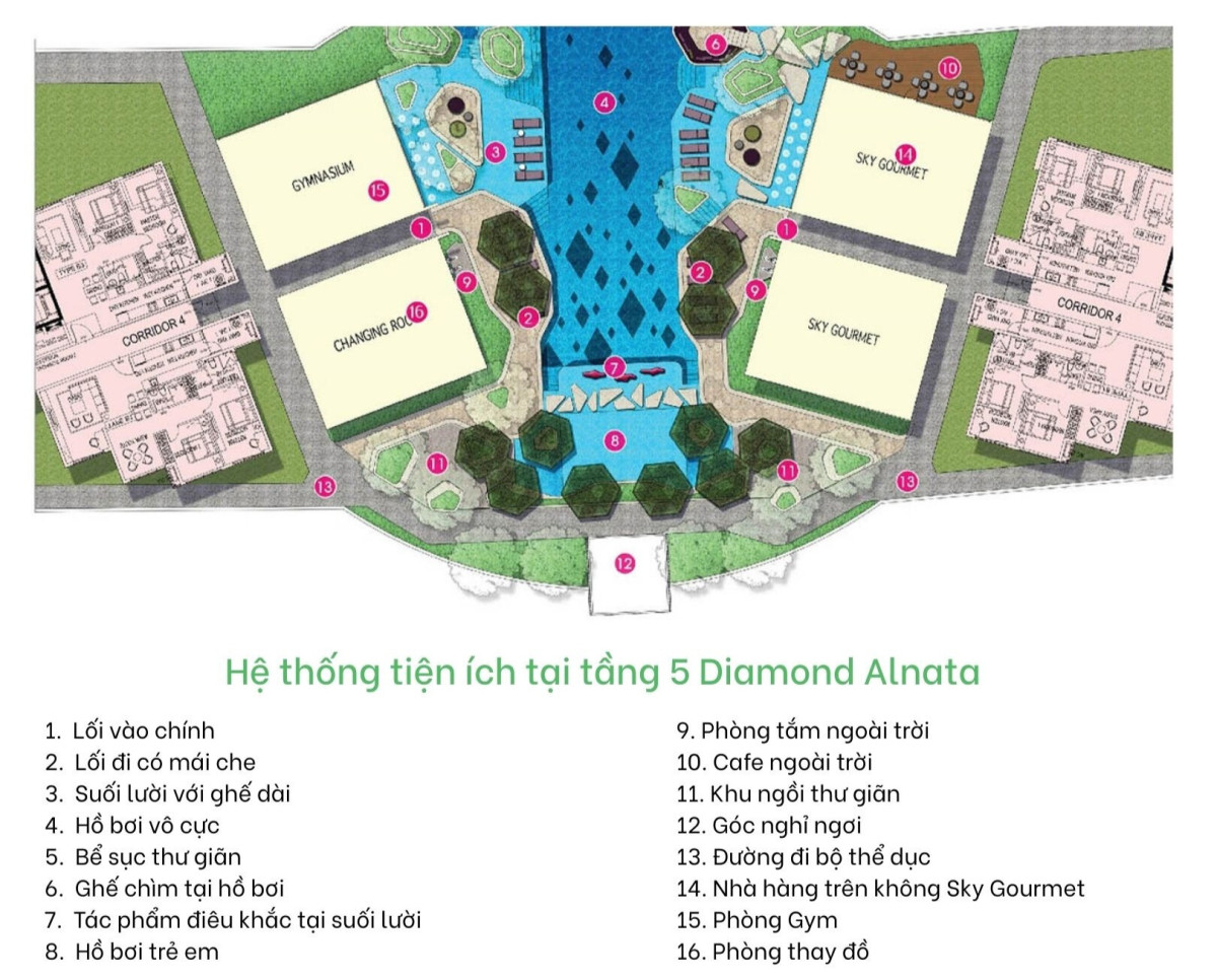 Diamond Alnata thừa hưởng hệ thống tiện ích trên mọi lĩnh vực của Celadon City – từ sinh hoạt, văn hóa, giáo dục đến giải trí và thể thao. Đặc biệt, tiểu khu kiến tạo những đặc quyền sống riêng với cụm tiện ích nội khu độc đáo, tập trung tại tầng 5 (ở độ cao 18m) – mang đến trải nghiệm "resort trên không" đẳng cấp và riêng tư.