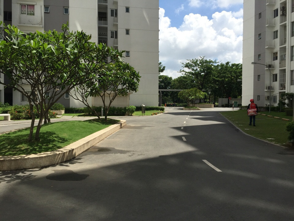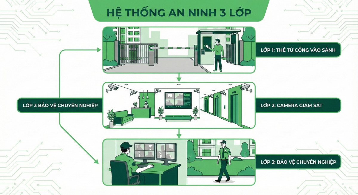 Về bố trí tháp: A nằm Tây Bắc gần sân chơi/sân trong phía Tây; B ở Bắc–trung tâm, tiếp cận thảm cỏ đa năng; C là cụm lõi ở trung tâm (lệch Nam) ôm quanh mảng xanh lớn; D ở trung tâm lệch Đông, kết nối thuận tới trục cảnh quan và khu Garden Hall; E bám biên Đông, kề East Playground. Đường nội khu tạo vòng kết nối các cụm, kèm các nút tròn/quảng trường nhỏ trên trục giữa để phân luồng và nhấn mạnh trải nghiệm cảnh quan.