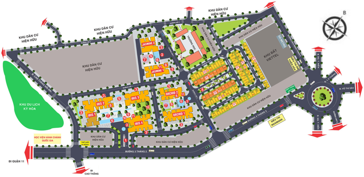 Để phân luồng giao thông hiệu quả, dự án được quy hoạch với 4 cổng chính: Cổng số 1 (118 đường 3/2) vào khu Orchid và Jasmine; Cổng số 2 (200 đường 3/2) là cổng chính vào khu nhà phố và Iris; Cổng số 3 (198 Cao Thắng nối dài) tiếp cận nhanh khu Iris và trường học; Cổng số 4 kết nối hẻm 285 CMT8 là lối đi phụ thuận tiện khi đường 3/2 đông xe.