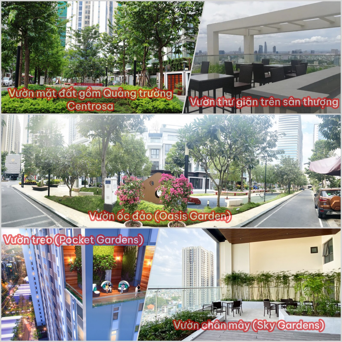 Hà Đô Centrosa Garden được mệnh danh là "khu vườn trong phố" với hệ thống 21 khu vườn xanh đa tầng – từ mặt đất lên đến tầng mái. Đây là điểm nhấn giúp dự án trở thành ốc đảo xanh hiếm có giữa trung tâm Quận 10.