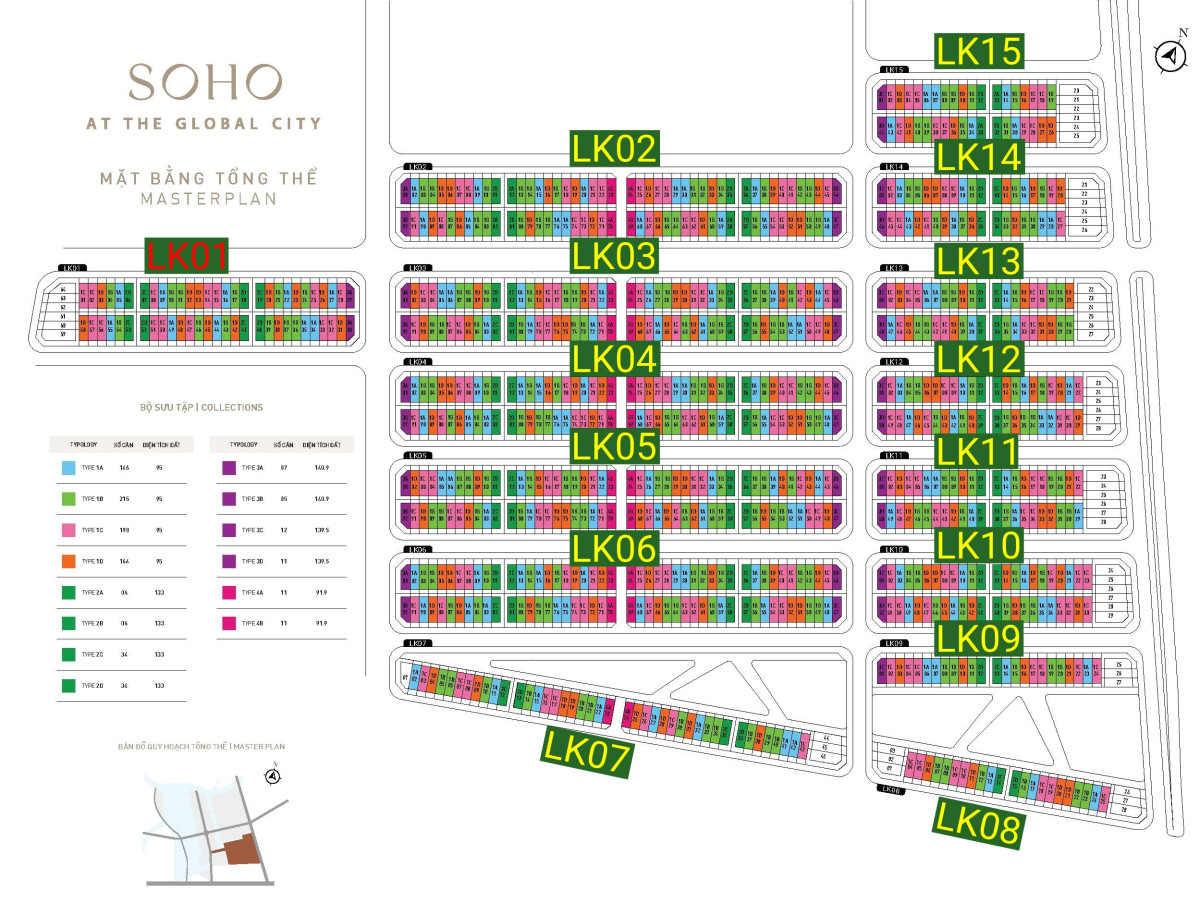 Cụm lô LK11 – LK12 – LK13 tọa lạc tại khu vực phía Nam Phân khu SOHO với tổng 148 căn nhà phố. Đây là vị trí chiến lược kết nối với hệ thống tiện ích an sinh của The Global City: Trung tâm thương mại hạng A 125.000m², Trường học liên cấp quốc tế và công viên cảnh quan.